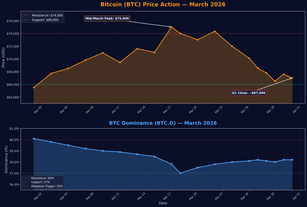 Bitcoin (BTC) is closing Q1 2026 on a turbulent note, trading around $67,000 after a volatile month that saw prices swing between $65,000 and $75,000. With the Crypto Fear & Greed Index plunging to just 11 deep in “Extreme Fear” territory and BTC Dominance holding steady at ~58.2%, the market stands at a critical crossroads. Here’s what top analysts on X (formerly Twitter) are saying, and what on-chain data reveals about where Bitcoin could be headed next.