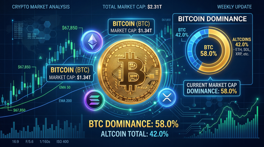 As of late March, CoinCodex data shows BTC Dominance at 58.22%, with Bitcoin’s market cap at $1.34 trillion against a total crypto market cap of $2.29 trillion.